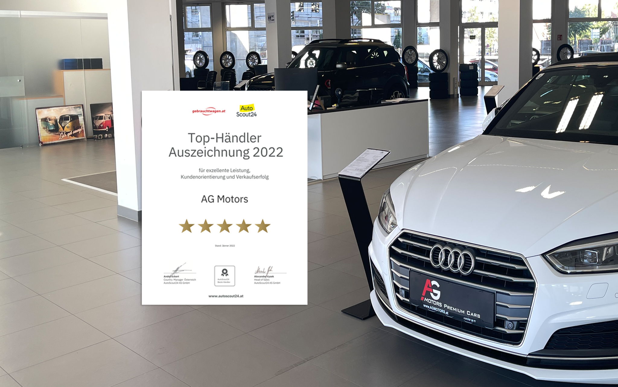 AutoScout24 und gebrauchtwagen.at zeichnen jährlich Händler mit besten Kundenbewertungen aus. Wir freuen uns, dass wir es nach mehreren Jahren mit Top-Bewertungen nun ganz an die Spitze der Autohäuser geschafft haben. In Wien hat AG Motors sogar Platz 1 unter den Bewertungen erreicht!